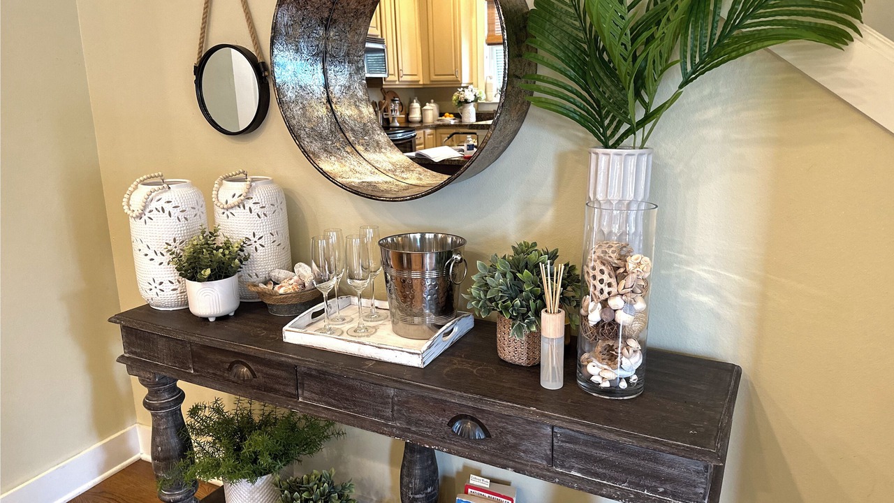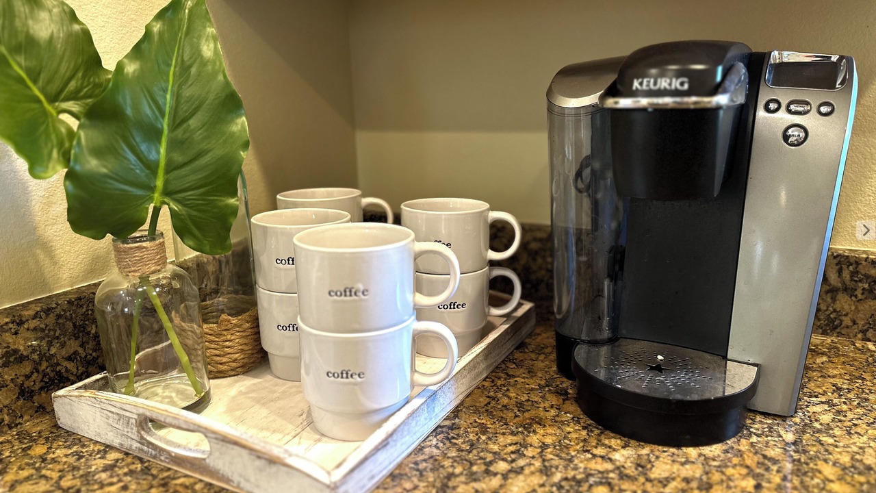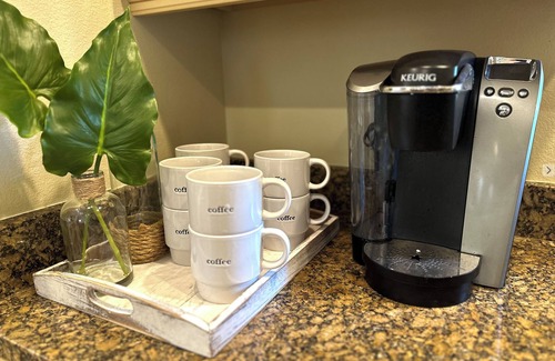 - Kitchen is well-stocked with everything needed for entertaining during your stay, including a pantry and an island with seating for 3.