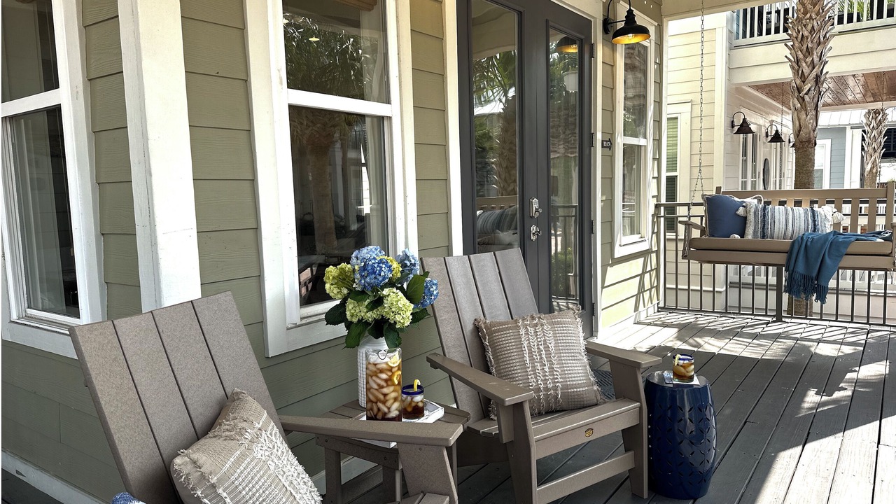 - Master Suite features a private, wrap-around covered porch, outfitted for complete relaxation with lounging sofa, club chairs, and a separate cafe table/chairs.