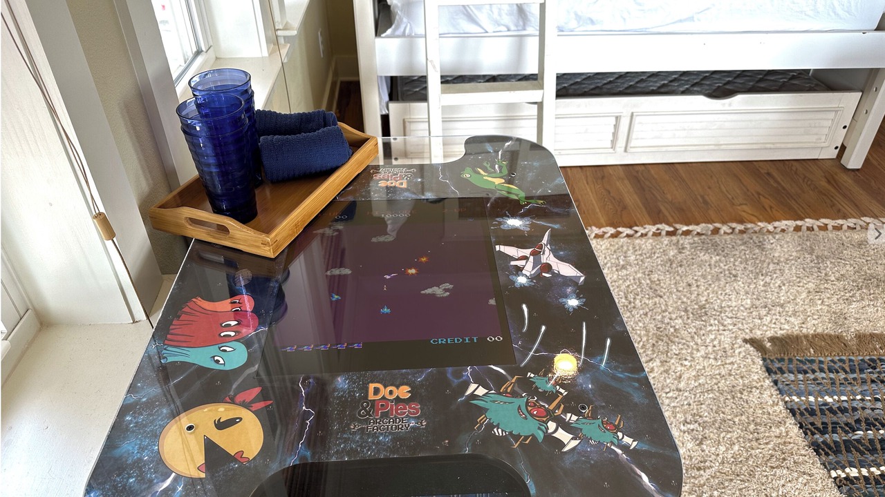 - Features a table-top, classic arcade machine (Pac Man, Galaga, etc)