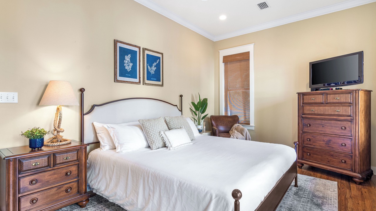 - Ground Floor Guest bedroom with King bed, ensuite bathroom (shower/tub combo), 32" TV, walk-in closet, and it's own porch with access to the rear parking spots in the driveway.