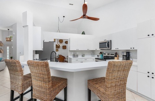 Our comfortable 3 Bed / 2 Bath home is stocked full of all the amenities you desire for home cooking, traveling with kids, enjoying the pool and beach, and a wonderful nights rest. The house offers a true indoor/outdoor living experience with the living room patio door opening completely to the lanai, and the primary bedroom equipped with patio doors leading out to the pool.