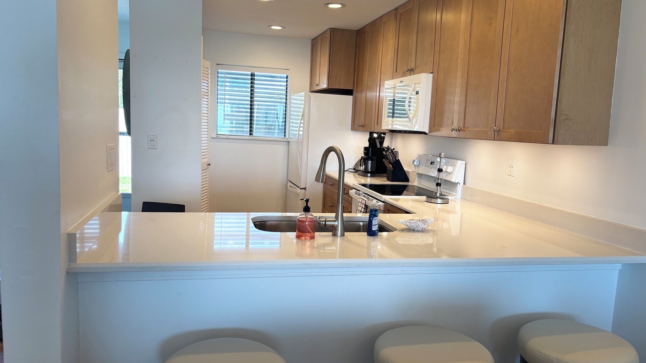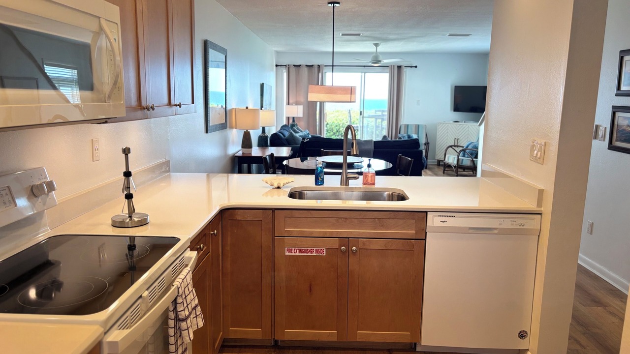 Inside, a fully stocked kitchen awaits the gourmet chef in you with all new appliances and plenty of cabinet space! Modern amenities like washer/dryer, complimentary high-speed WiFi, flat screen tv's in every room, and new ice-cold AC await you. The open floor plans/living spaces on the first include panoramic views of the Ocean and white sand beaches. The upstairs boasts two main bedrooms both with ensuite bathrooms. Master has a walk out deck with the most amazing Ocean views. King bed in master and queen in guest room along with plenty of storage make your stay seamlessly comfortable!
