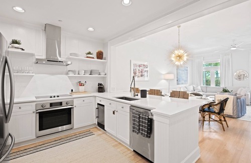 The gourmet kitchen boasts quartz counter tops, stainless steel appliances, breakfast bar, and a spacious dining area + a spacious living area with doors that open on to the porch. Sit and enjoy the Florida breezes while relaxing on one of the covered porches or take a short walk over to Seaside for more eating, shopping and entertainment!