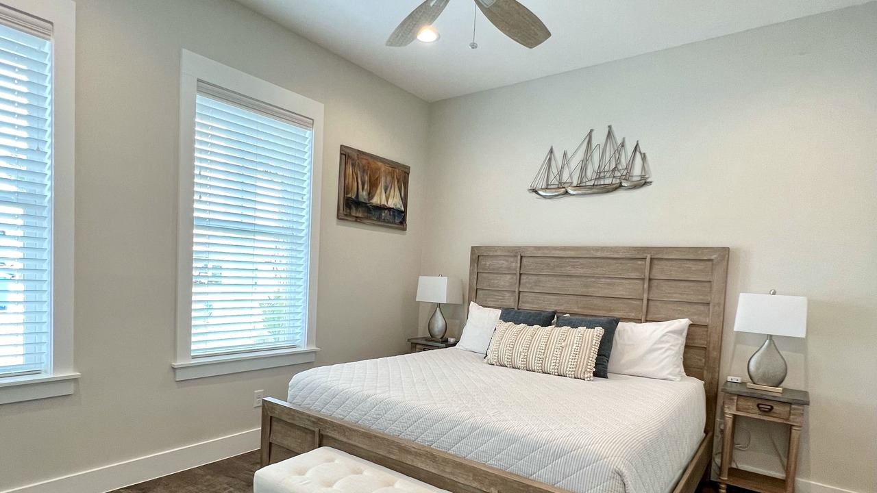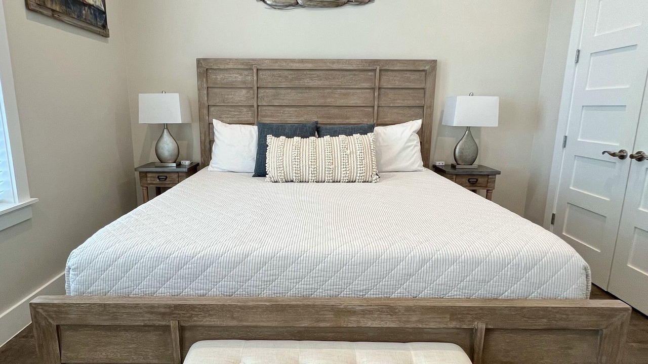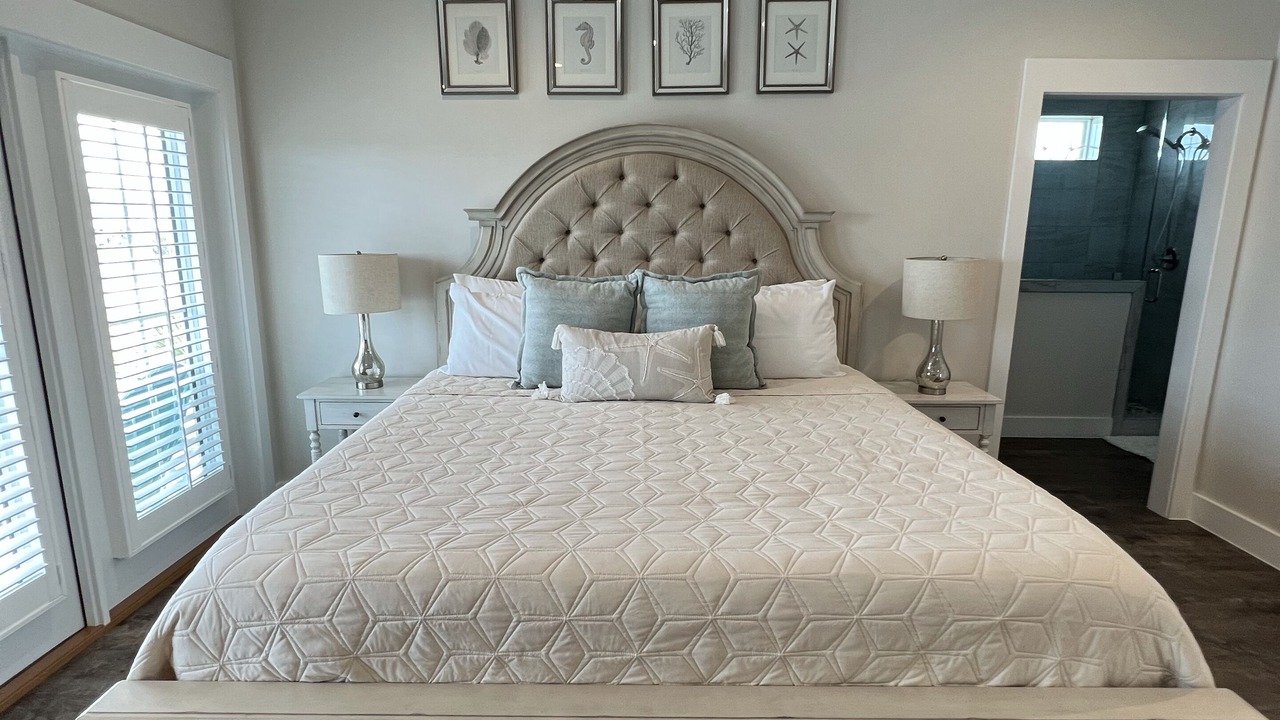 There are TWO master bedrooms - one downstairs and one upstairs - both with a king bed and en suite bathroom. Two additional bedrooms upstairs with queen beds, and a bunk room with four twin XL beds.