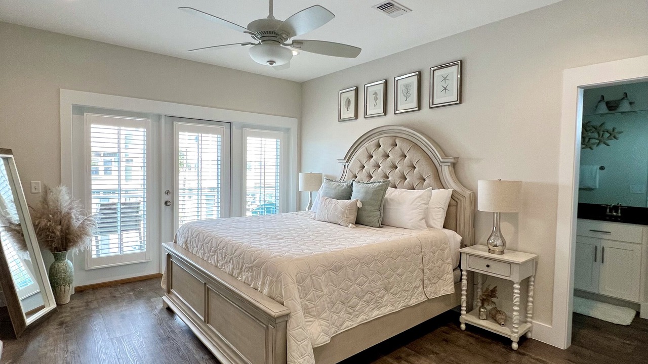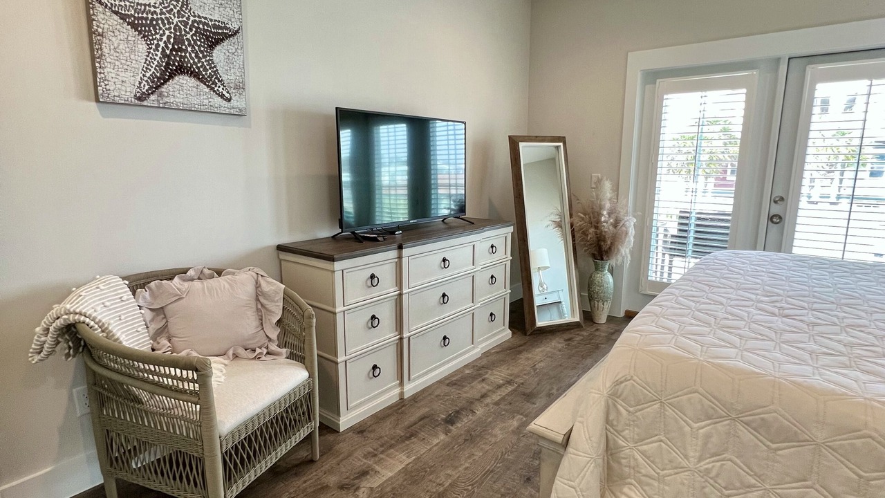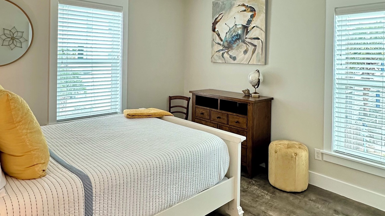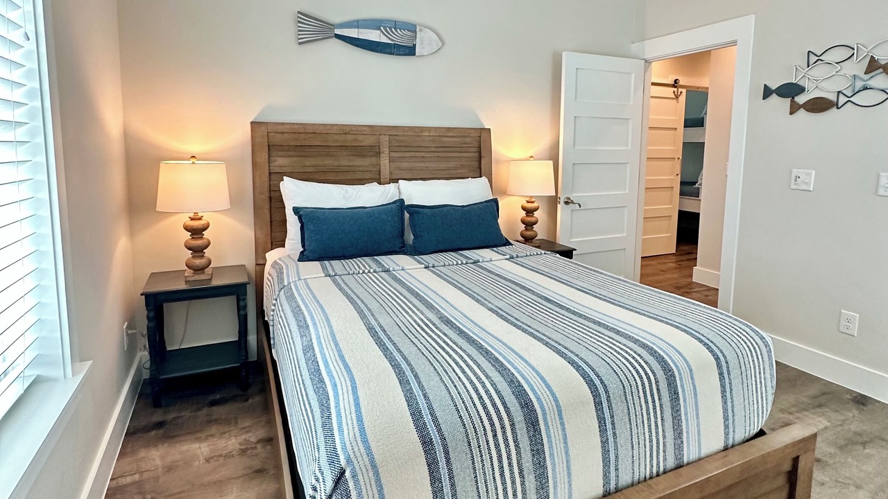 There are TWO master bedrooms - one downstairs and one upstairs - both with a king bed and en suite bathroom. Two additional bedrooms upstairs with queen beds, and a bunk room with four twin XL beds.