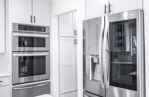 This pool area features a propane grill and ample lounge seating throughout. This home is an idyllic space for both fun and relaxation. "ETERNAL SUNSHINE" is the perfect home for your family to relax and unwind! Exquisite finishes include 2 kitchens with quartz countertops, modern stainless steel appliances, and a large open floor plan designed to entertain and flow with the outdoor amenities.
