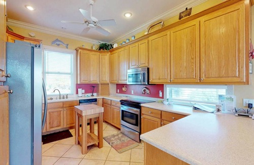 The dining room seats 10 for fantastic coastal meals, and the well-appointed kitchen with stainless steel appliances will make any chef happy. A breakfast bar that seats three is perfect for your morning cup of coffee or a quick sandwich.