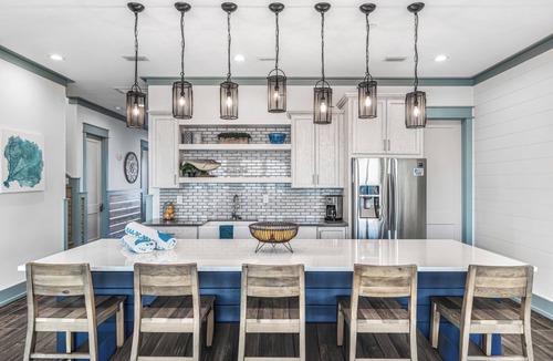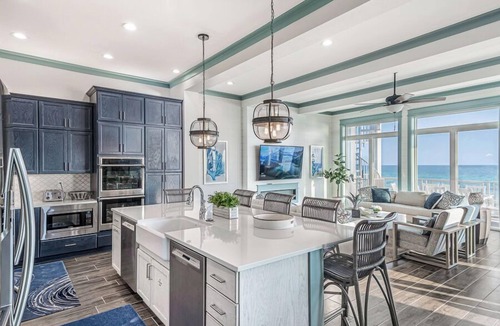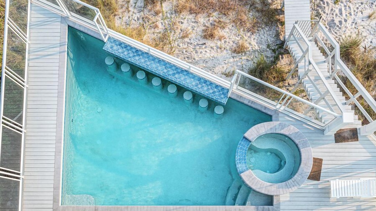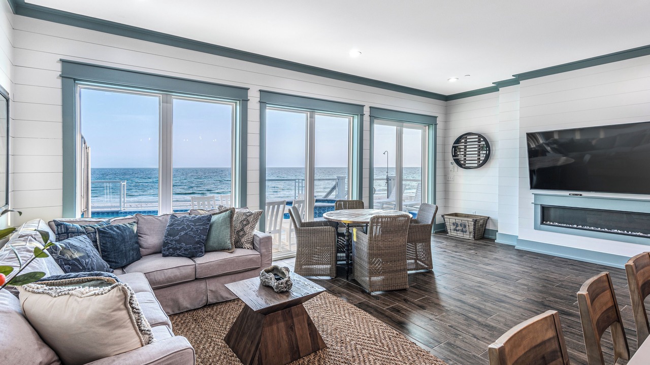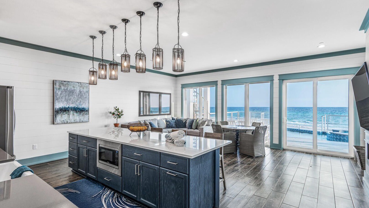 The first floor features direct walkout access to the most unique beachfront pool we have in our entire line up of vacation homes boasting 7 in-pool barstools so you can sit and watch the waves roll in! There are also 2 bedrooms as you first walk through the front door - one twin over full bunk room (street view) and one full bedroom (beach view), each with their own private en-suite.