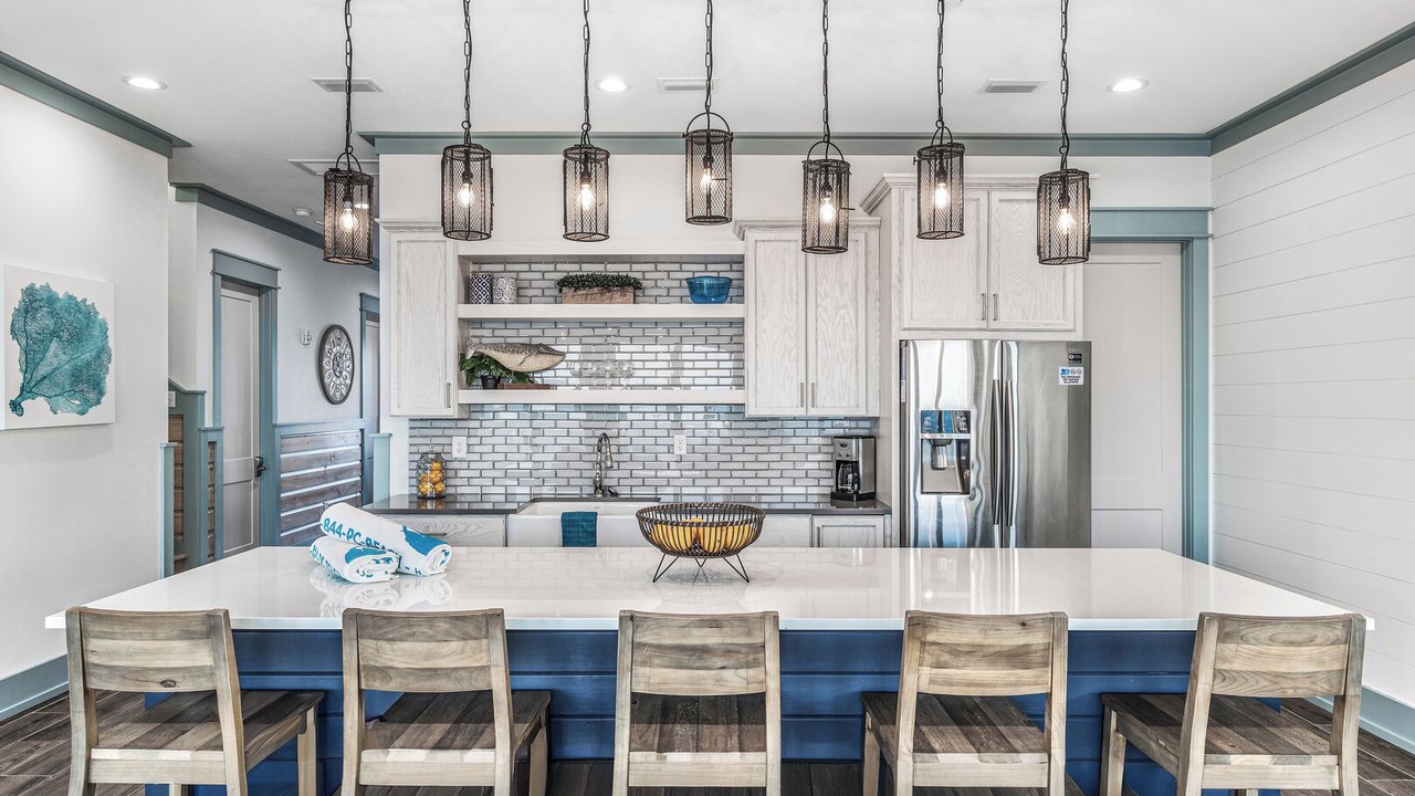 As you head up the stairs to the second floor you are greeted with stunning beachfront views from your main kitchen/living room/dining room area, you'll definitely want to take advantage of the walkout balcony on this floor! The kitchen features 2 refrigerators, 2 ovens, an induction cooktop and 2 dishwashers. The dining area sits 20 plus the 5 at the bar and the spacious living area is waiting for you to enjoy the views. Down the hall are two additional bedrooms with one twin over full bunk room (street view) and king bedroom (street view), both have their own private en-suite.