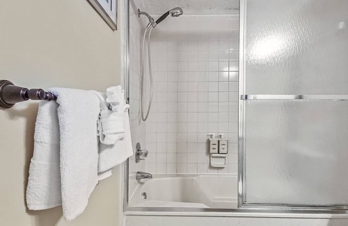 Master King, Downstairs Guest Queen, plus 2 Twin beds upstairs in the open loft bedroom, sleeper in the living room. New Kitchen and Bathroom. New Laminate wood living/dining and new carpet in bedrooms, new Refrigerator, and new Kitchen and Bathroom Cabinets and Granite Counters. 40" TV and Blue Ray player in the living room. Total of 4 TVs. No-Smoking. Spiral staircase up to large open loft bedroom with draperies for privacy and 2 two twin beds plus 2 twins rollaway, bath, and open balcony. Sleeps 10. Washer/dryer downstairs by the kitchen. Includes garage.