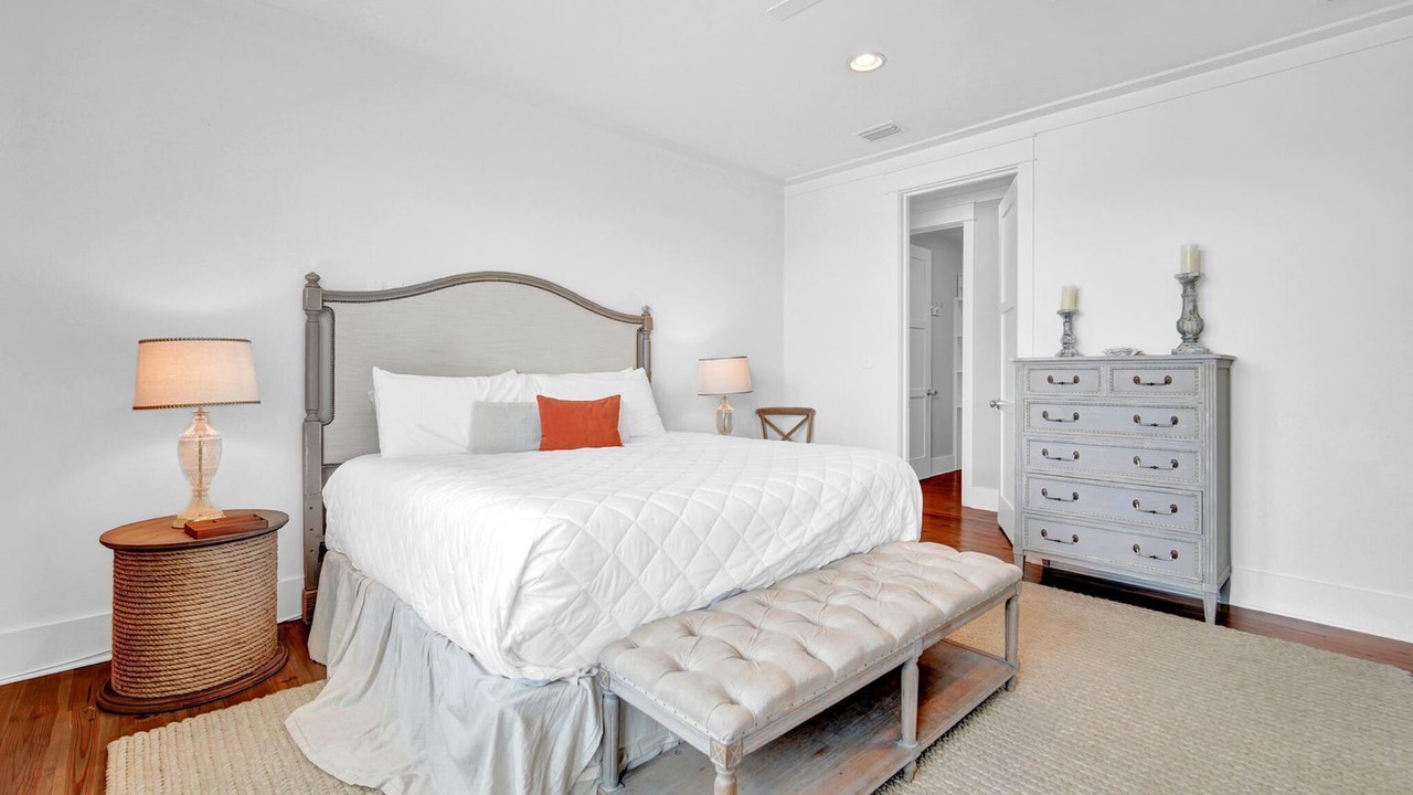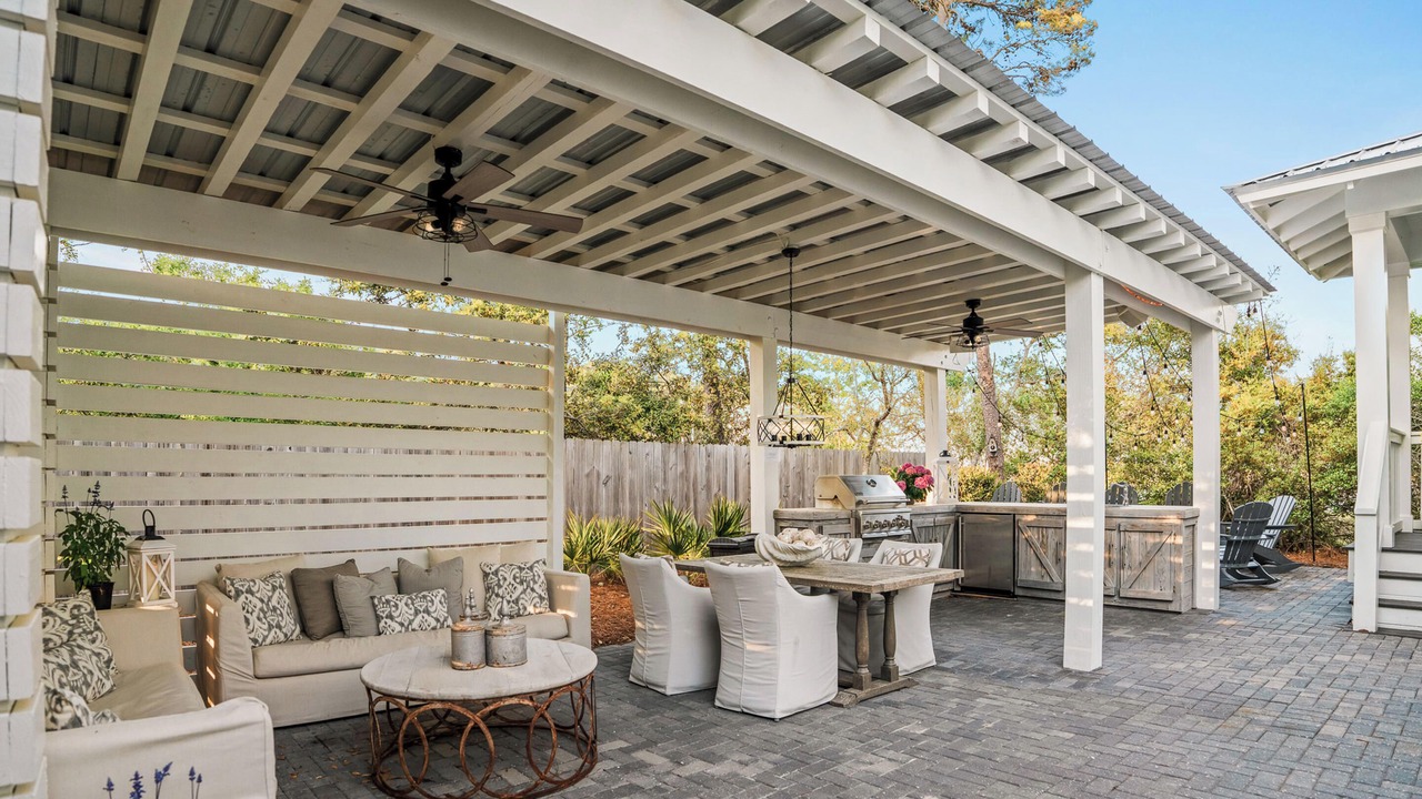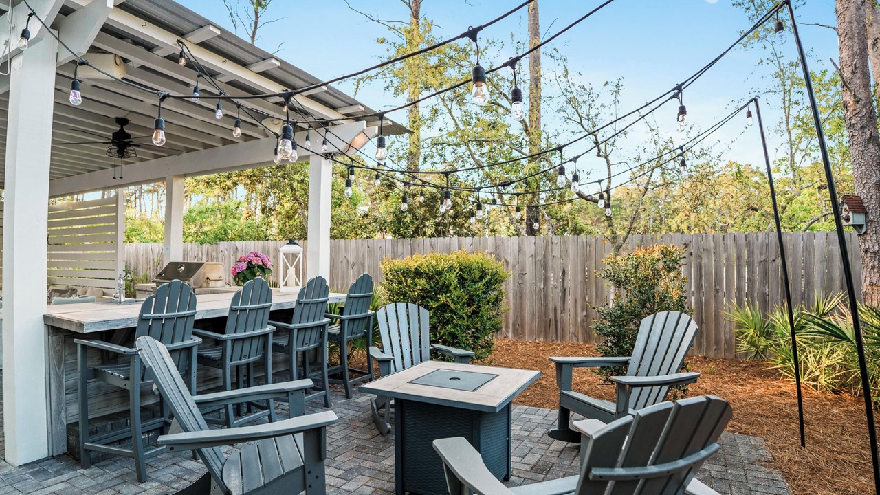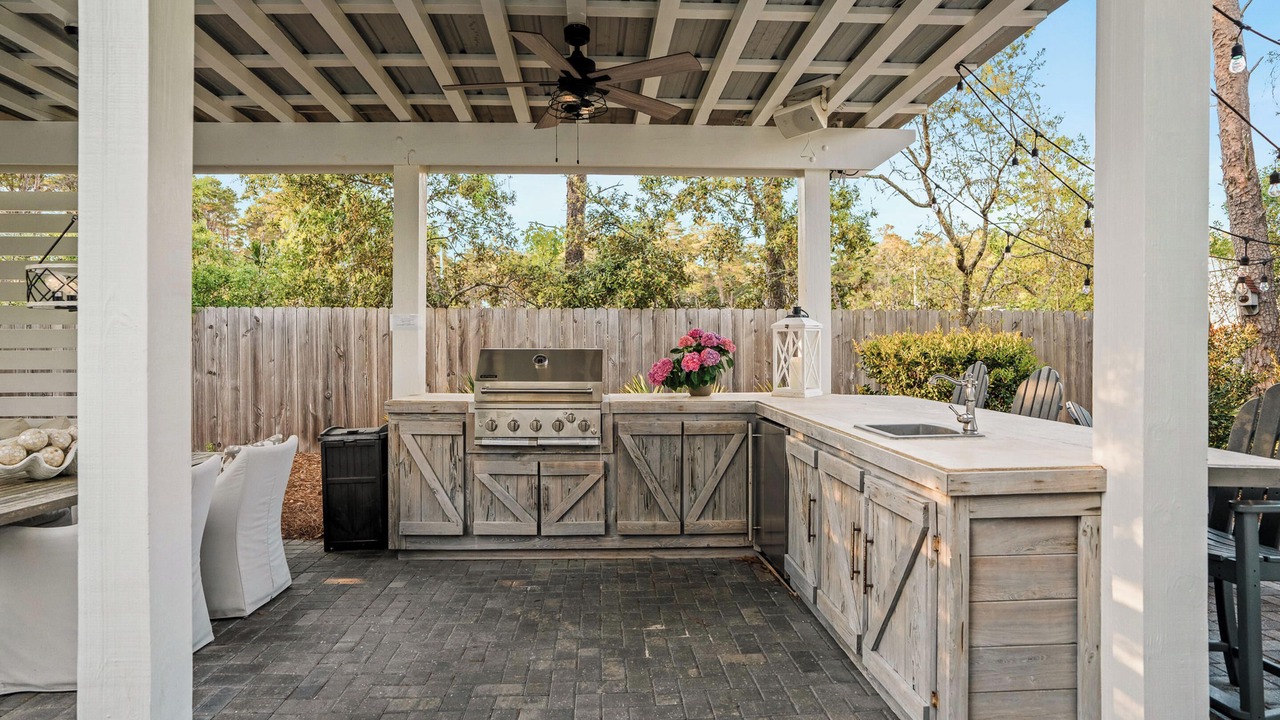 With four bedrooms, three and a half bathrooms, and over 2,400 square feet, this home can easily accommodate up to eight guests. Each member of your travel party will have ample space to unpack, unwind, and unplug. Upon arrival, drop your bags at the door and start exploring your new home away from home! Discover hardwood floors throughout, coastal décor, and natural light making this rental your own personal oasis. Your kitchen comes fully equipped with everything you need and is even finished with quartz countertops and stainless-steel appliances. Utilize this space for preparing beach snacks, warming up leftovers for lunch, or whipping up some beach-inspired appetizers to be savored on the back patio. There is even a summer kitchen on the back patio with a Blackstone Propane Griddle and a gas grill, plus a refrigerator if you feel like cooking a meal outdoors one evening during your stay. The private patio wraps around the living area. You are sure to spend most of your evenings here enjoying the gentle Gulf breeze. There is nothing better than ending a beach day with a refreshing beverage outdoors watching your kids play and watching the sun go down. There is also an outdoor shower if you want to rinse off after a dip in the pool or a trip to the beach. The living room is the perfect spot to retreat once the sun has set. Kick back and relax on the couch. Turn on the Smart TV to choose a movie and host a family movie night before heading to bed.