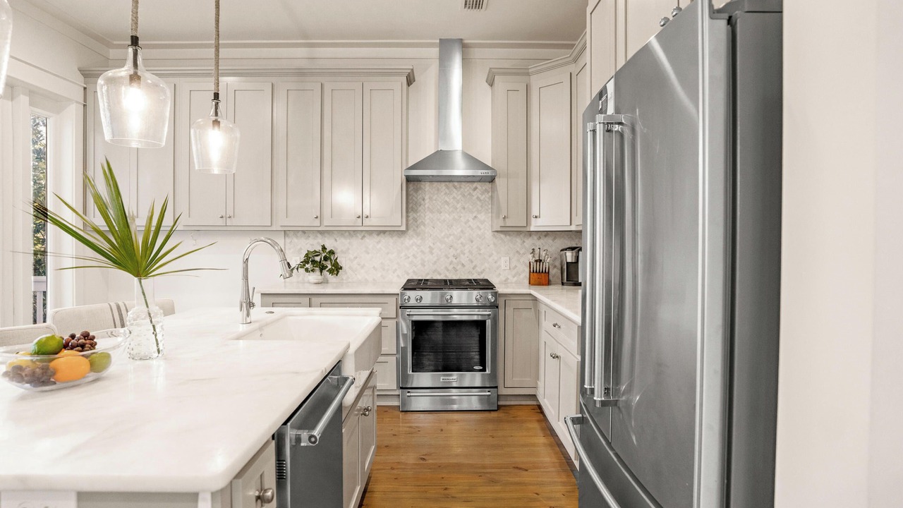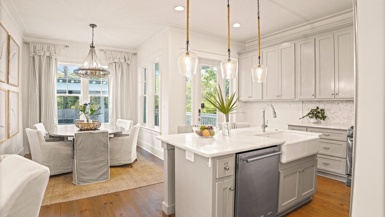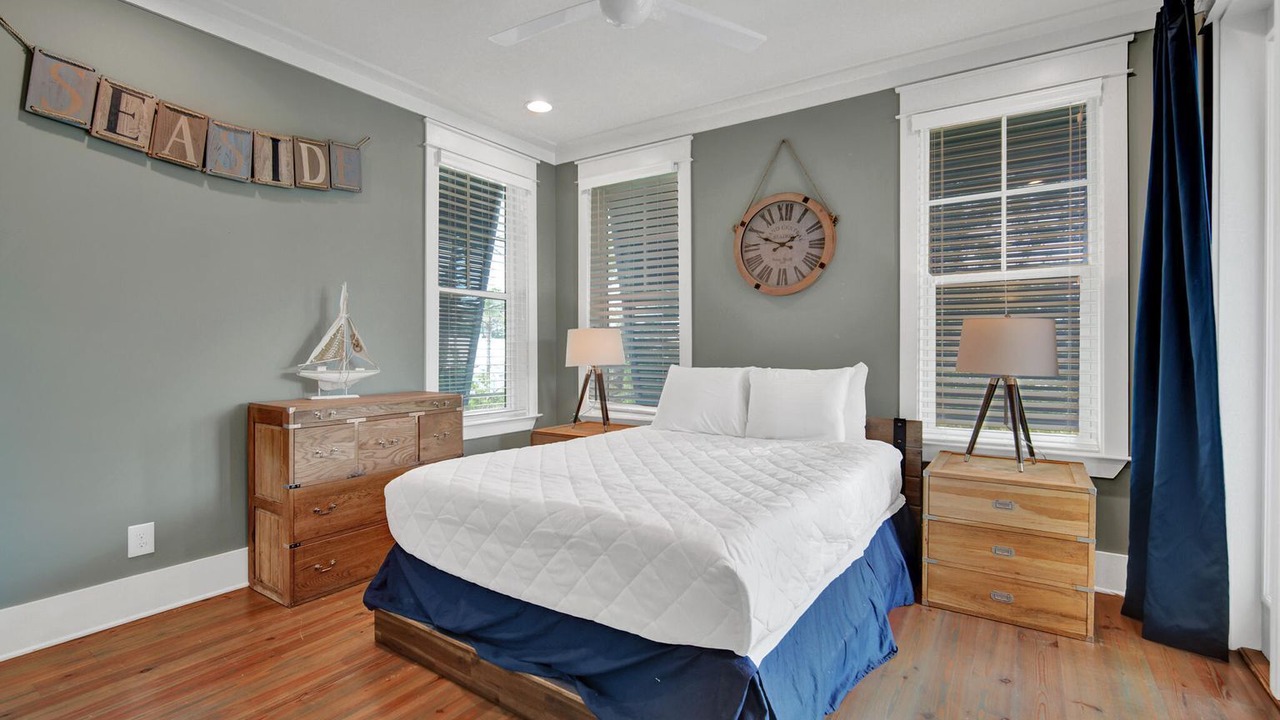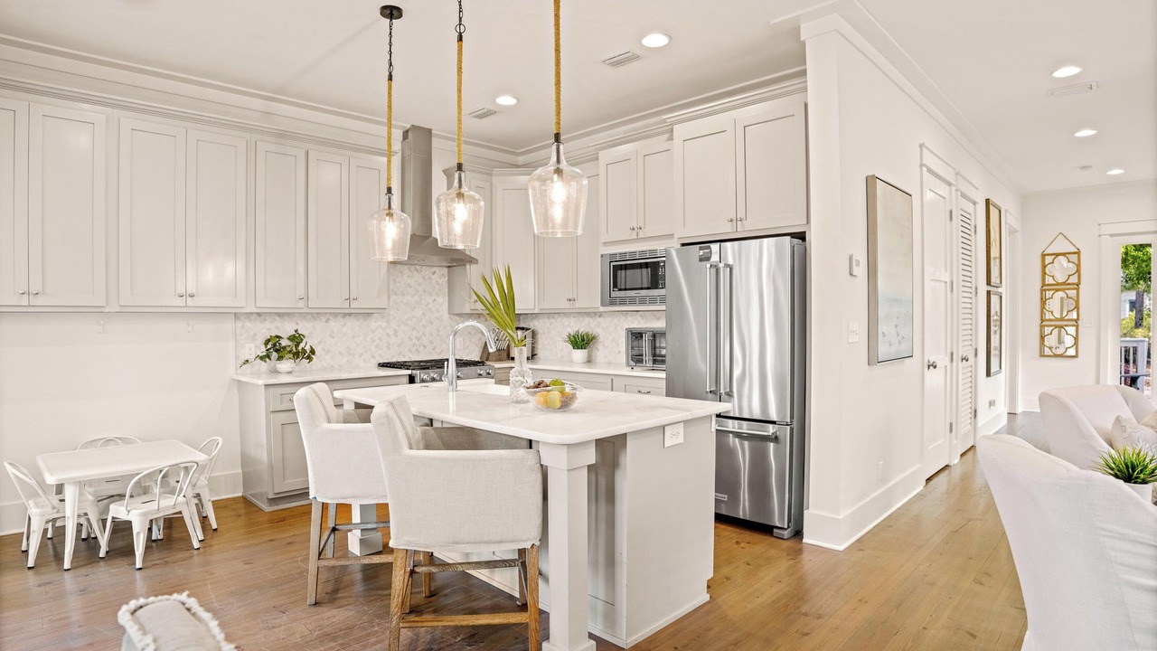 With four bedrooms, three and a half bathrooms, and over 2,400 square feet, this home can easily accommodate up to eight guests. Each member of your travel party will have ample space to unpack, unwind, and unplug. Upon arrival, drop your bags at the door and start exploring your new home away from home! Discover hardwood floors throughout, coastal décor, and natural light making this rental your own personal oasis. Your kitchen comes fully equipped with everything you need and is even finished with quartz countertops and stainless-steel appliances. Utilize this space for preparing beach snacks, warming up leftovers for lunch, or whipping up some beach-inspired appetizers to be savored on the back patio. There is even a summer kitchen on the back patio with a Blackstone Propane Griddle and a gas grill, plus a refrigerator if you feel like cooking a meal outdoors one evening during your stay. The private patio wraps around the living area. You are sure to spend most of your evenings here enjoying the gentle Gulf breeze. There is nothing better than ending a beach day with a refreshing beverage outdoors watching your kids play and watching the sun go down. There is also an outdoor shower if you want to rinse off after a dip in the pool or a trip to the beach. The living room is the perfect spot to retreat once the sun has set. Kick back and relax on the couch. Turn on the Smart TV to choose a movie and host a family movie night before heading to bed.