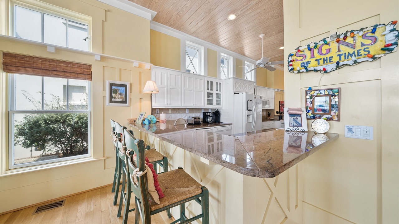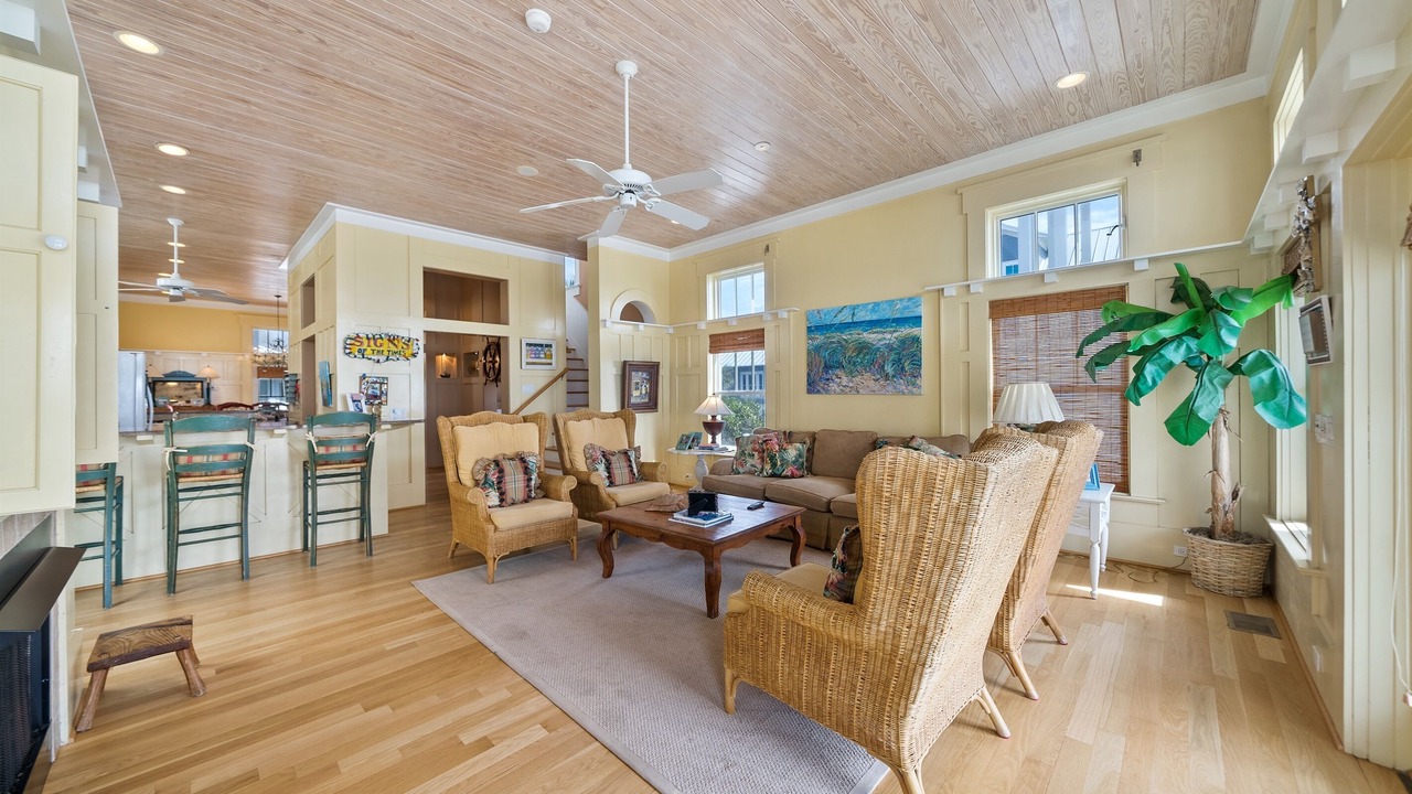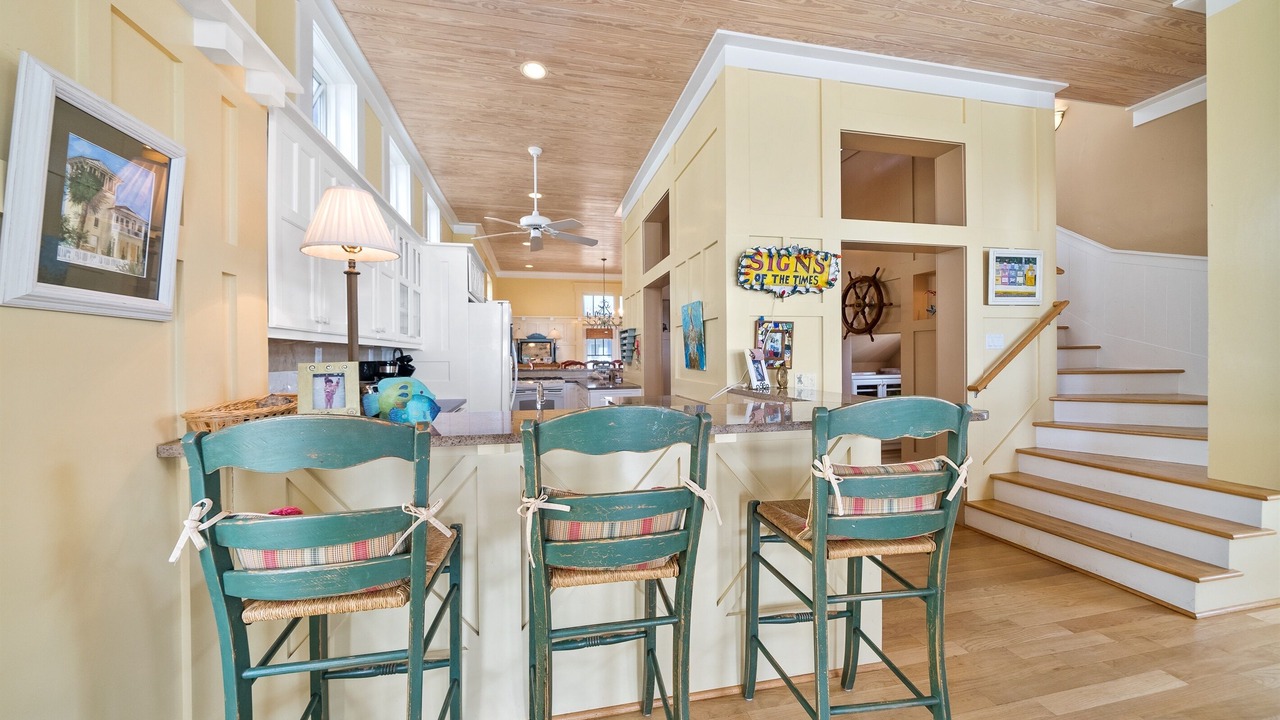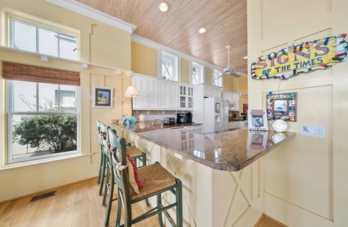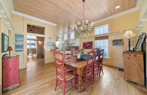 Shangri-La is a custom-built architectural masterpiece, a three-story, sky-blue 'sandcastle', thoughtfully designed to blend beauty, comfort, and functionality. Behind it, nestled within a charming white picket-fenced courtyard, is our two-story carriage house, La-Ti-Da, creating a private oasis perfect for families, friends, and even your four-legged companions—yes, we are PET FRIENDLY!