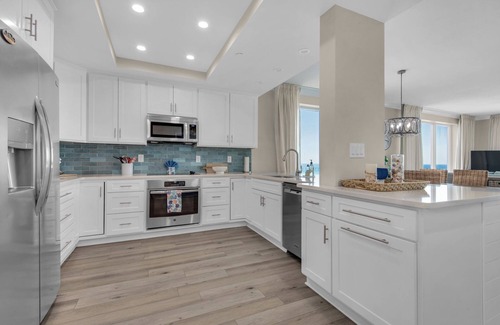 Welcome to Sit Back and Relax, a beautifully updated 3-bedroom, 3-bath Gulf-front condo located on the 6th floor of the Caribbean Resort. Spanning over 1,800 square feet, this open-concept retreat is designed for comfort, space, and coastal luxury. The living area features panoramic floor-to-ceiling windows, HD smart TVs in every room, and a fully equipped kitchen with bar seating and a dining table for sixโperfect for family meals or beachside relaxation.