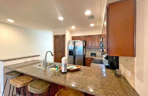 The second level offers a master bedroom with a king bed furnished with luxurious bedding, a 43" Smart TV, and a wonderful on suite bathroom. The second bedroom is equally relaxing with a queen bed with nature themed bedding and 32" Smart TV. The modern kitchen is ideal for cooking offering appliances with stainless steel finishes and granite counter tops for an added modern touch. The town home amenities include covered parking, onsite grill, garden tub and complimentary high speed internet.