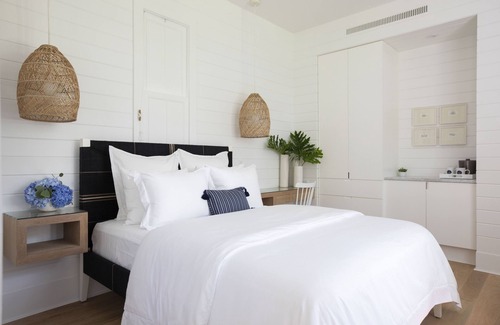 There are six standard court-style rooms. Each court-style room features a queen bed, a custom-designed built-in desk nook perfect for working remotely, a designated built-in coffee station nook, incredible private bathrooms, and a view of the beautifully landscaped central garden and open green called The Lawn. Each room has been flawlessly designed, from luxury Peacock Alley linens to coastal Serena & Lily furnishings throughout. All rooms have ample built-in custom storage, a built-in coffee station complete with a Nespresso maker, an under-counter refrigerator in the room, and two plush bathrobes for use during your stay. Every room has an oversized bathroom with a large bathroom vanity, a marble-tiled walk-in shower, and a rainfall showerhead and shower wand.