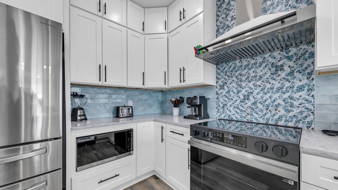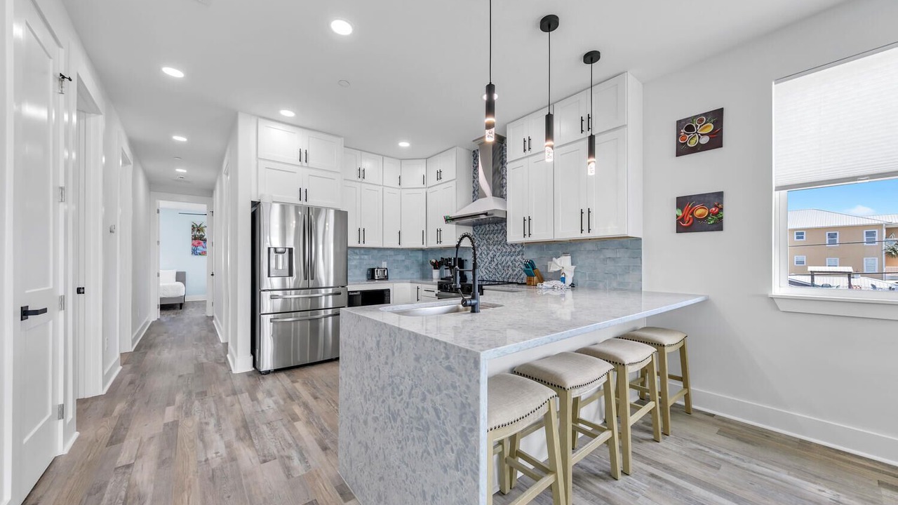 The first floor offers a large gathering space with a Game table that includes pool, ping pong, and air hockey and a Foosball table for hours of fun that also conveniently allows access to the back patio and the private pool. The first floor also includes a queen bedroom and en suite, another full bathroom, an office work space and the first of two laundry rooms. The second floor offers the large open kitchen, living and dining area for family dinners, balcony to enjoy morning coffee or evening sunset watching. There is also a guest bedroom with a queen bed and another guest bedroom with two queen beds, as well as, one full bath and one half bath. The third floor brings you to the beautiful cozy King master with a private ensuite with exquisite high end finishes and a private balcony over looking the emerald green water of the Gulf! Further down the hall on this floor is a Wet Bar area with a wine cooler, a second laundry room and two more bedrooms - One bedroom with a Twin over king bunk and one with two more queen beds, and another full bathroom. In total, this unit can comfortably sleep up to 17 guests.