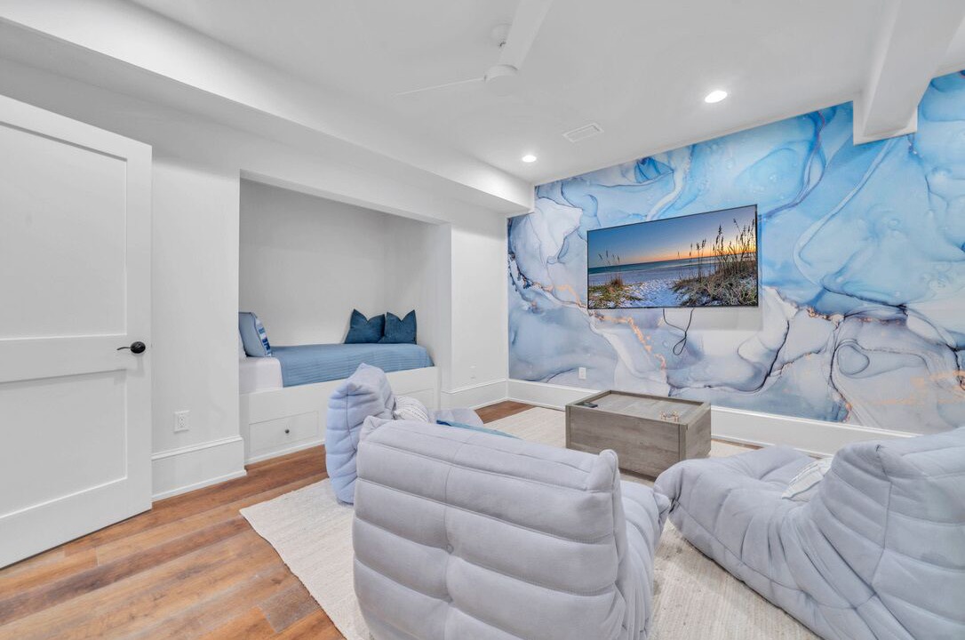 LOWER LEVEL: Common area, built-in bunk bed, twin bed, TV, Door to Pool/Shared Bath