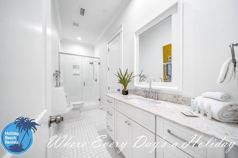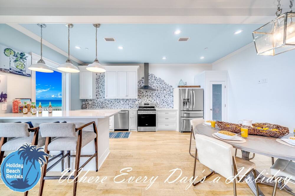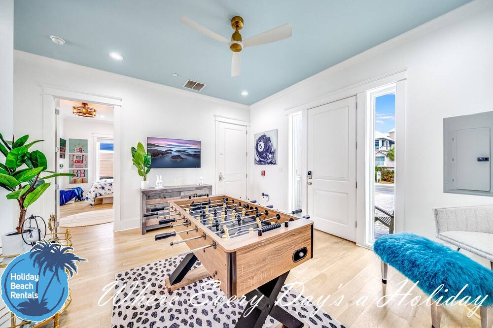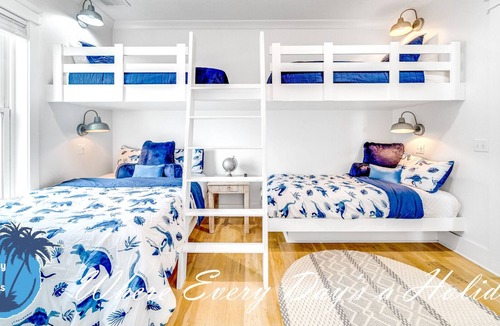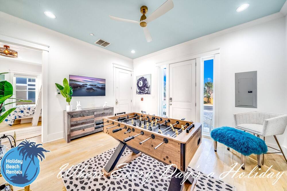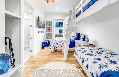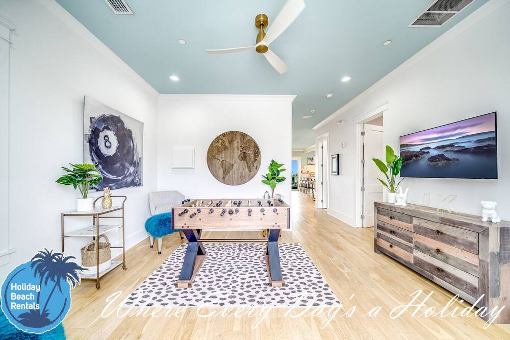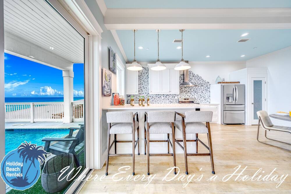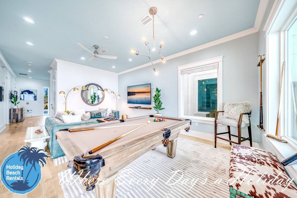 As you first walk through the front door, there is a small sitting area (with a fun foosball table) that leads down the hall to a multi-bunk room featuring a twin over twin bunk and twin over queen bunk. This room also shares its en-suite with the rest of the ground floor. The beachside common area has a pool table, flat screen TV, eat-in bar for 6, full dining table for 8 and fully-equipped kitchen. You'll find this to be the most convenient space for those quick snack grabs or drink refills when coming in from your pool or the beach. Easy in, easy out. The pool deck has an amazing beachfront view and leads down to the beach boardwalk for everyone to enjoy. For convenience, we also made sure to provide an outdoor shower.