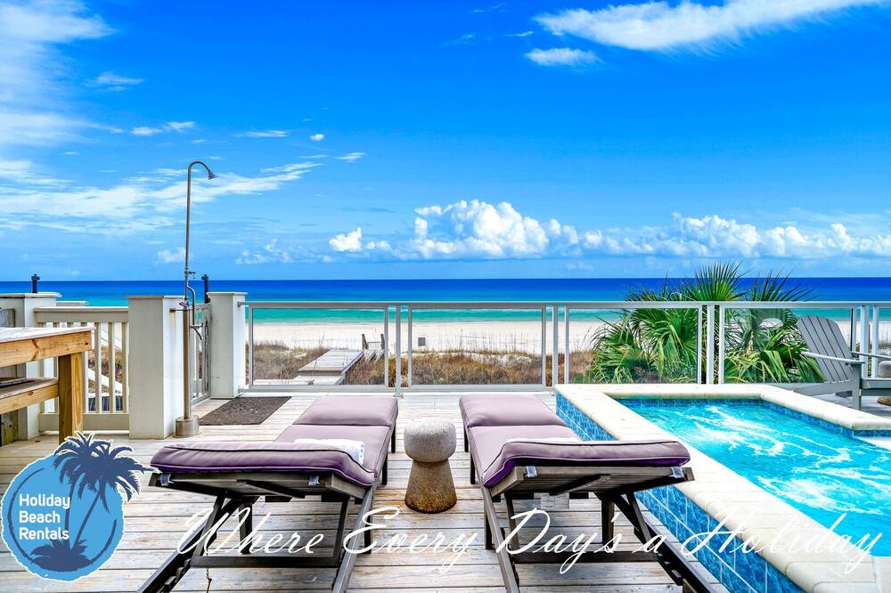 "Sunset" is one of our largest vacation homes, located on the quiet West end of Panama City Beach. With 9 uniquely laid out bedrooms, this abode comfortably accommodates up to 26 guests. It features private amenities such as an outdoor pool, a fully-equipped kitchen, flat screen TV's throughout and private driveway that can hold up to 7 moderately sized vehicles. We've named it "Sunset," mainly because of its Westward location on the white sandy beach, perfect way to end your beach day...sitting on your private deck watching the sun fade behind the Gulf.
