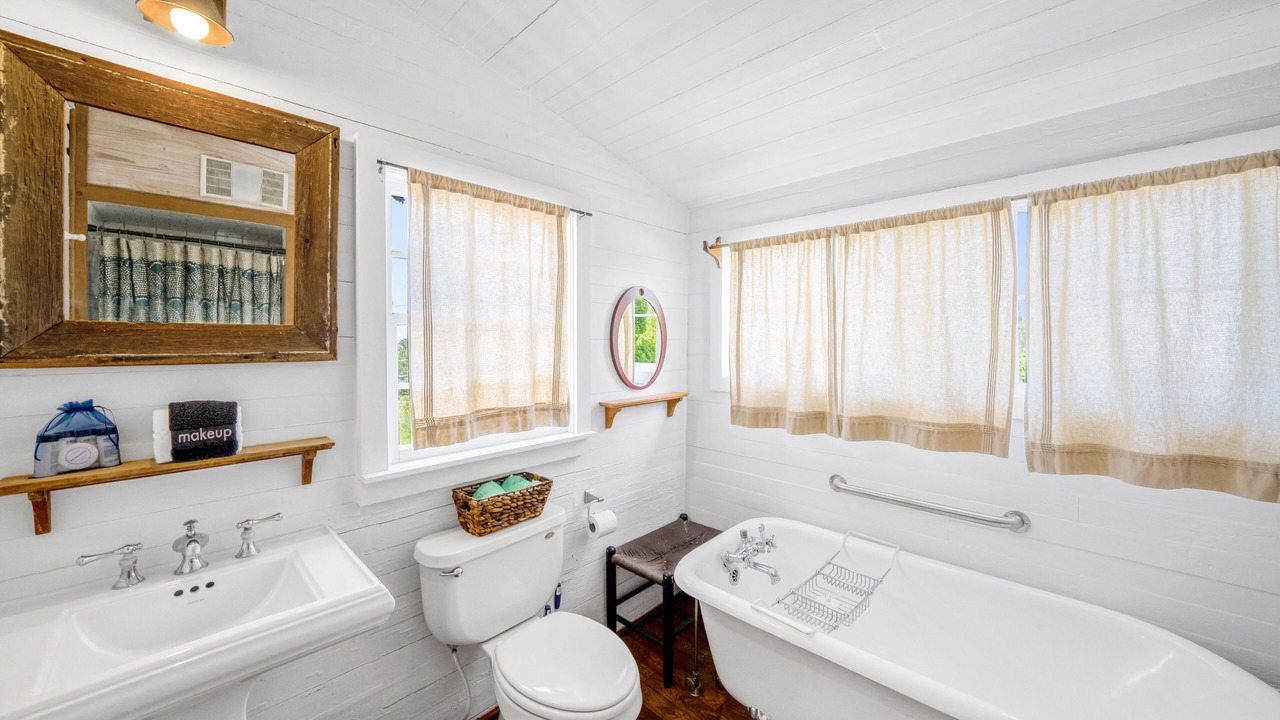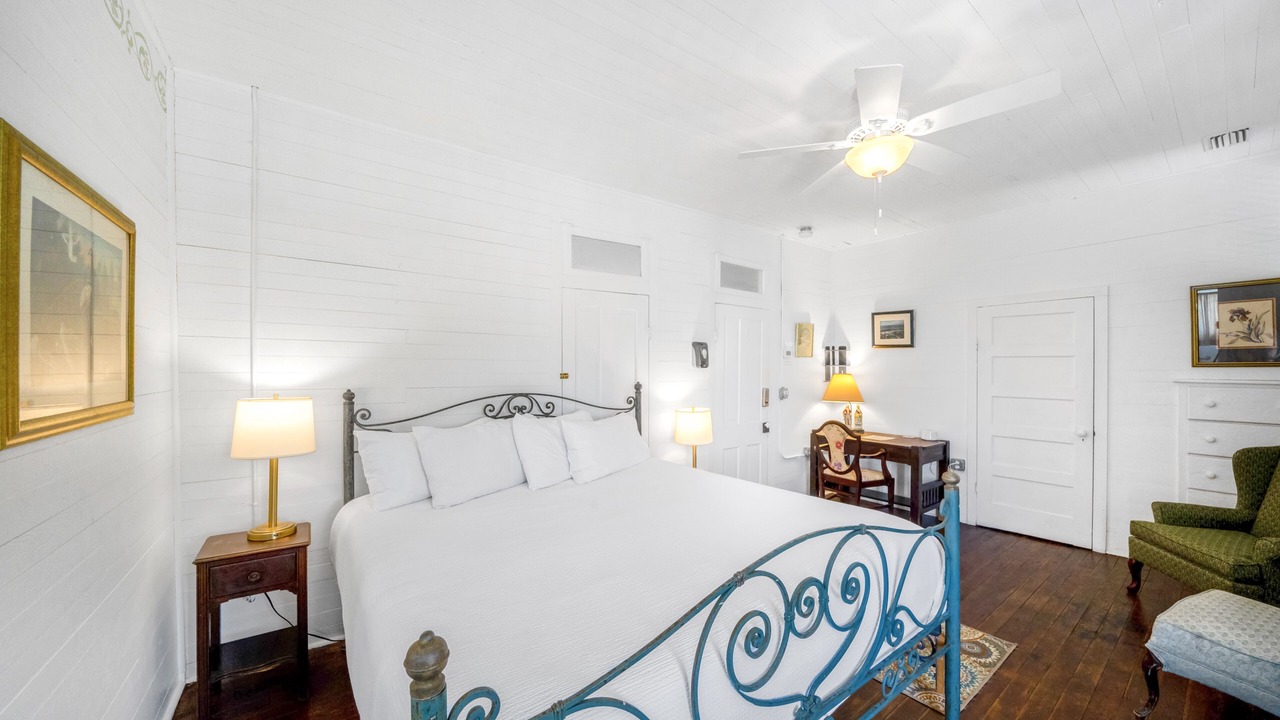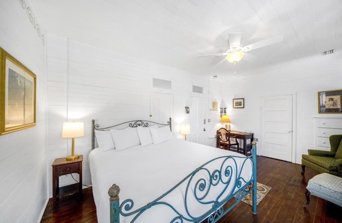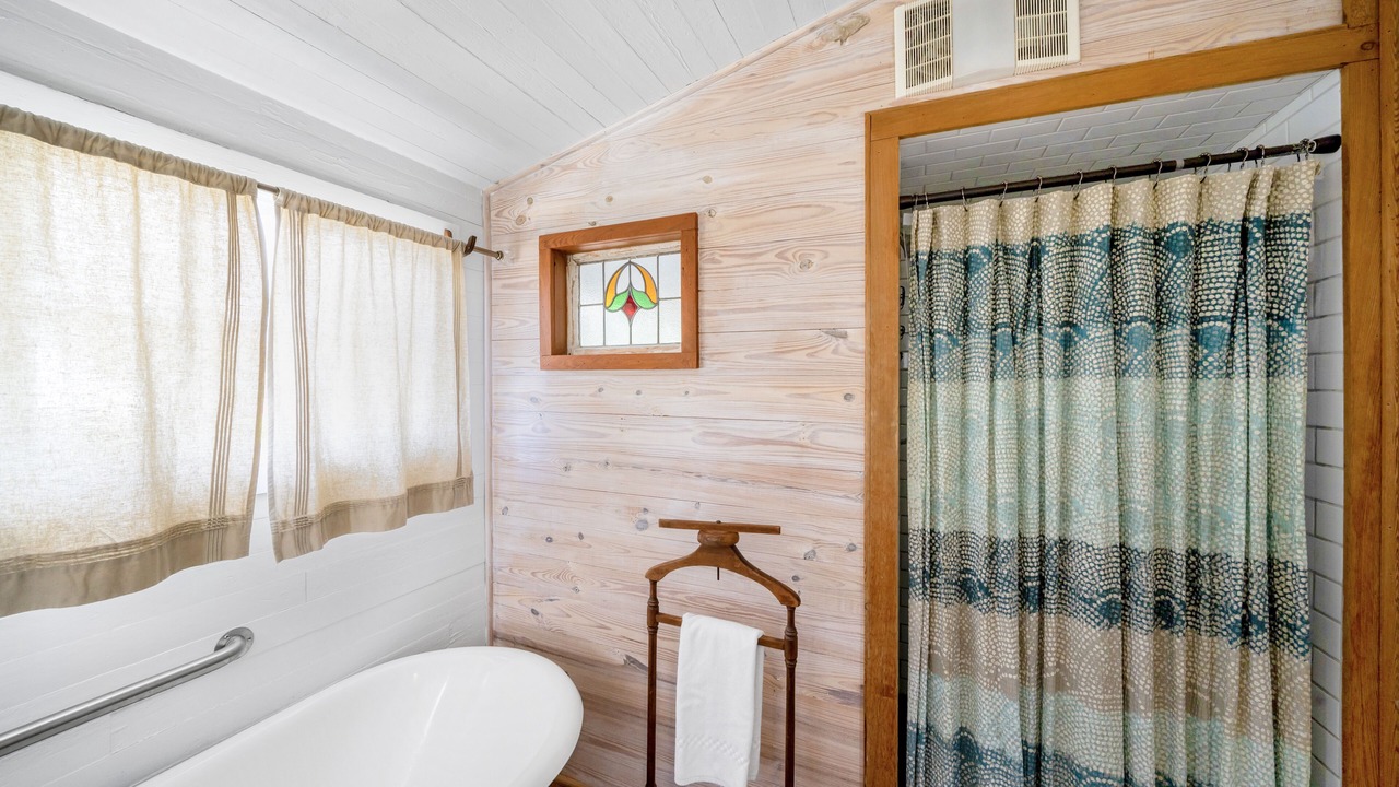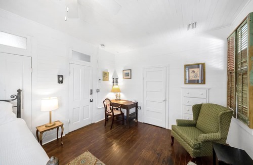 Enter Gorrie's Getaway, where privacy meets historic charm at the Bowery Inn in downtown Apalachicola. Enjoy the beautiful river views directly from your room via French doors that open to a large deck. Relax in your king-size room featuring a clawfoot bathtub and contemporary conveniences like power outlets and USB ports, offering you a comfortable and connected stay.