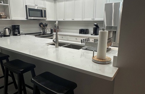 Fully equipped kitchen with VERTU Nespresso machine, stove, oven, microwave, fridge/freezer with ice maker, dishwasher,