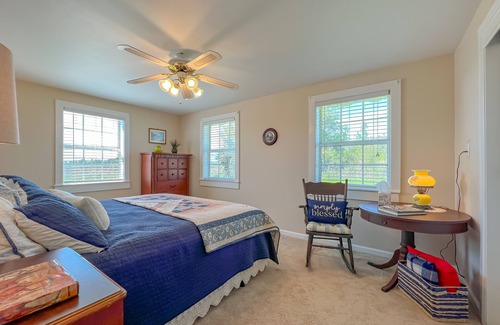 It is surrounded by a front porch with rockers and a screened in side porch with table to enjoy meals outside with your family. The back porch overlooks the firepit and deer feeder. The are is very peaceful and our guests are very complimentary on our house. It is located on twelve acres and has a circular driveway.