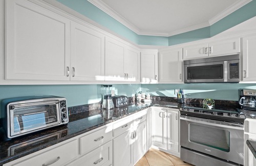 The primary bedroom has a king size bed with adjoining private bath. The second bedroom has two twin size beds and adjoining bath. Upon request a Pack-n-play, twin size cot, or a queen size blow-up air mattress is available for additional guest(s). The fully equipped kitchen and dining area seats offers spectacular views of the Gulf and seats 6 guests at the table or three people at the breakfast bar. The living area has reclining swivel chairs, leather furniture, and smart TV's. There is also a washer & dryer in in the condo. FREE Wifi and FREE Parking! Available by request we have a portable baby crib, highchair, twin size cot and queen size blow-up mattress.