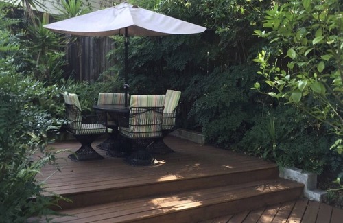 Includes: total privacy; washer/dryer; central AC/heat; private garden and deck; privacy fence; private entrance; pool and sauna privileges; private off-street parking; full kitchen; dining area; NON-SMOKING; Furnished.