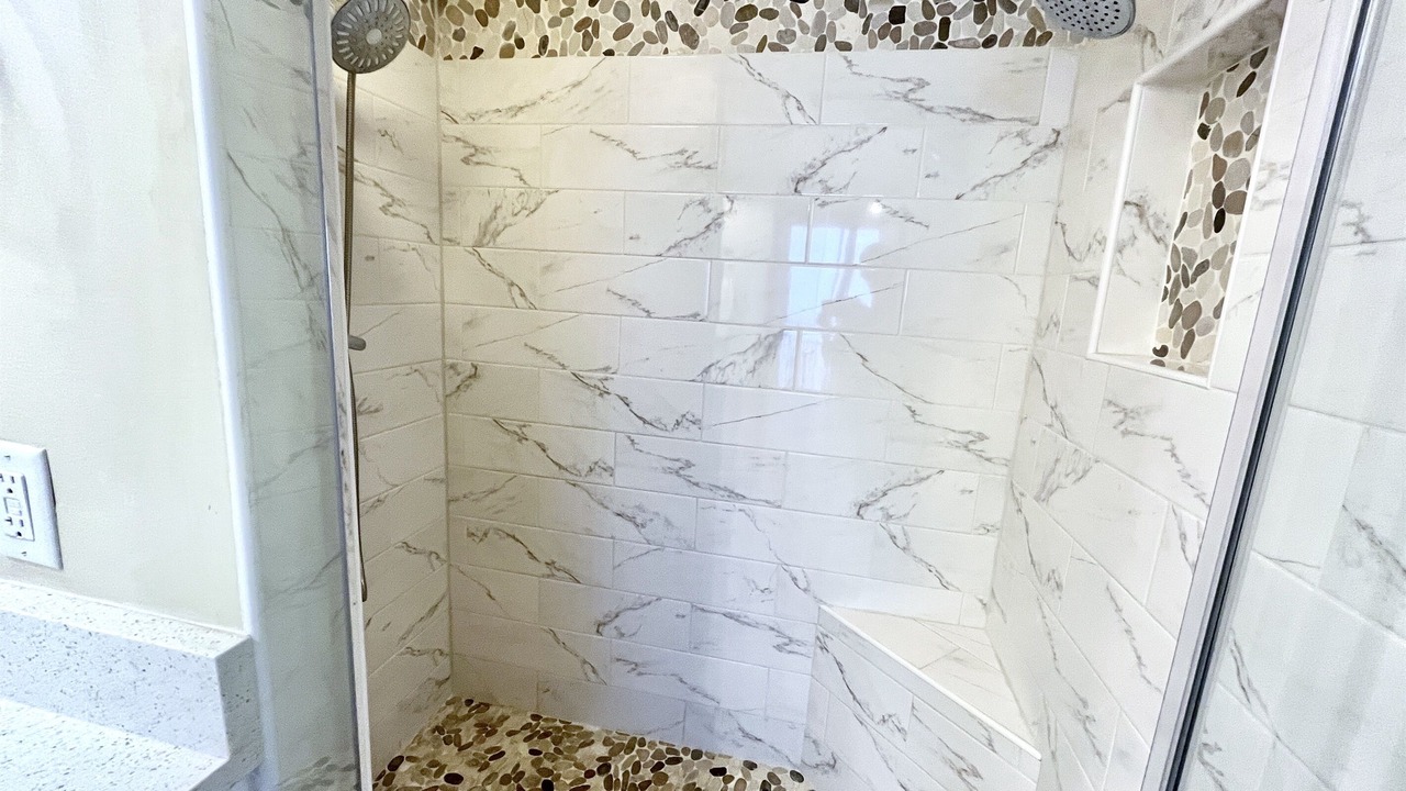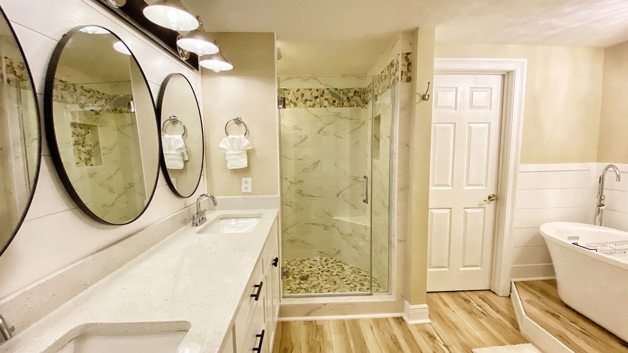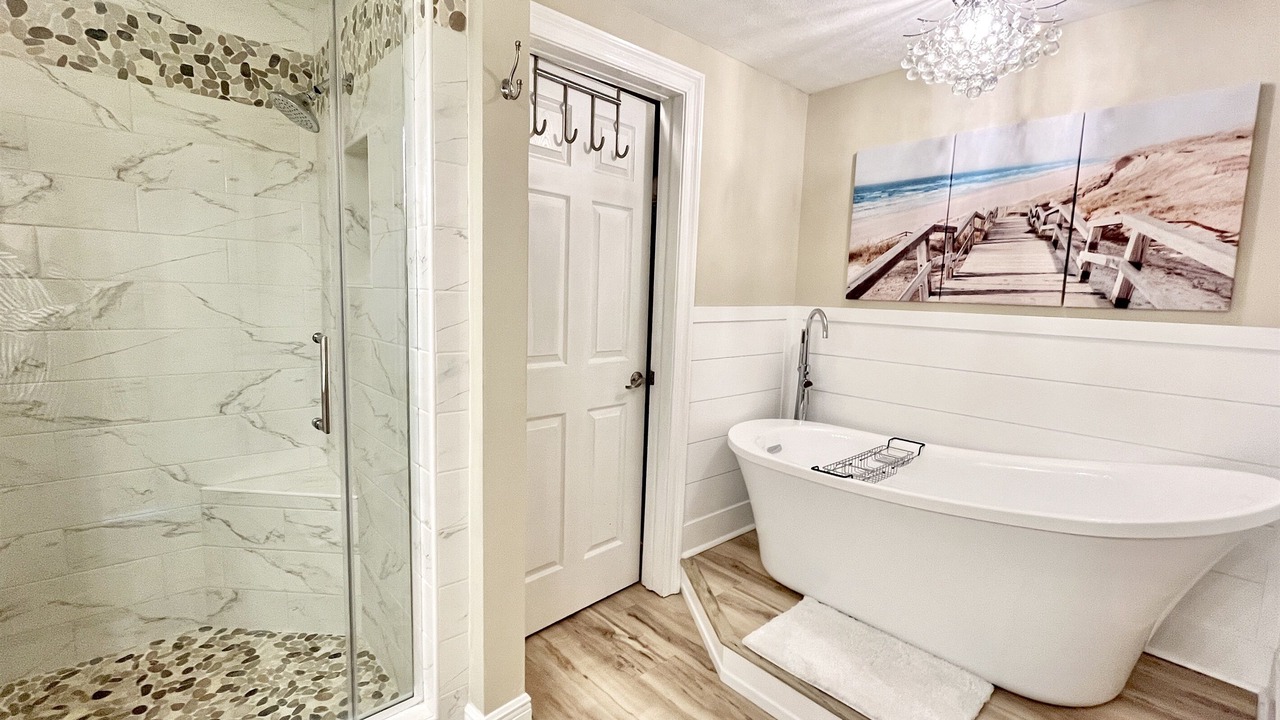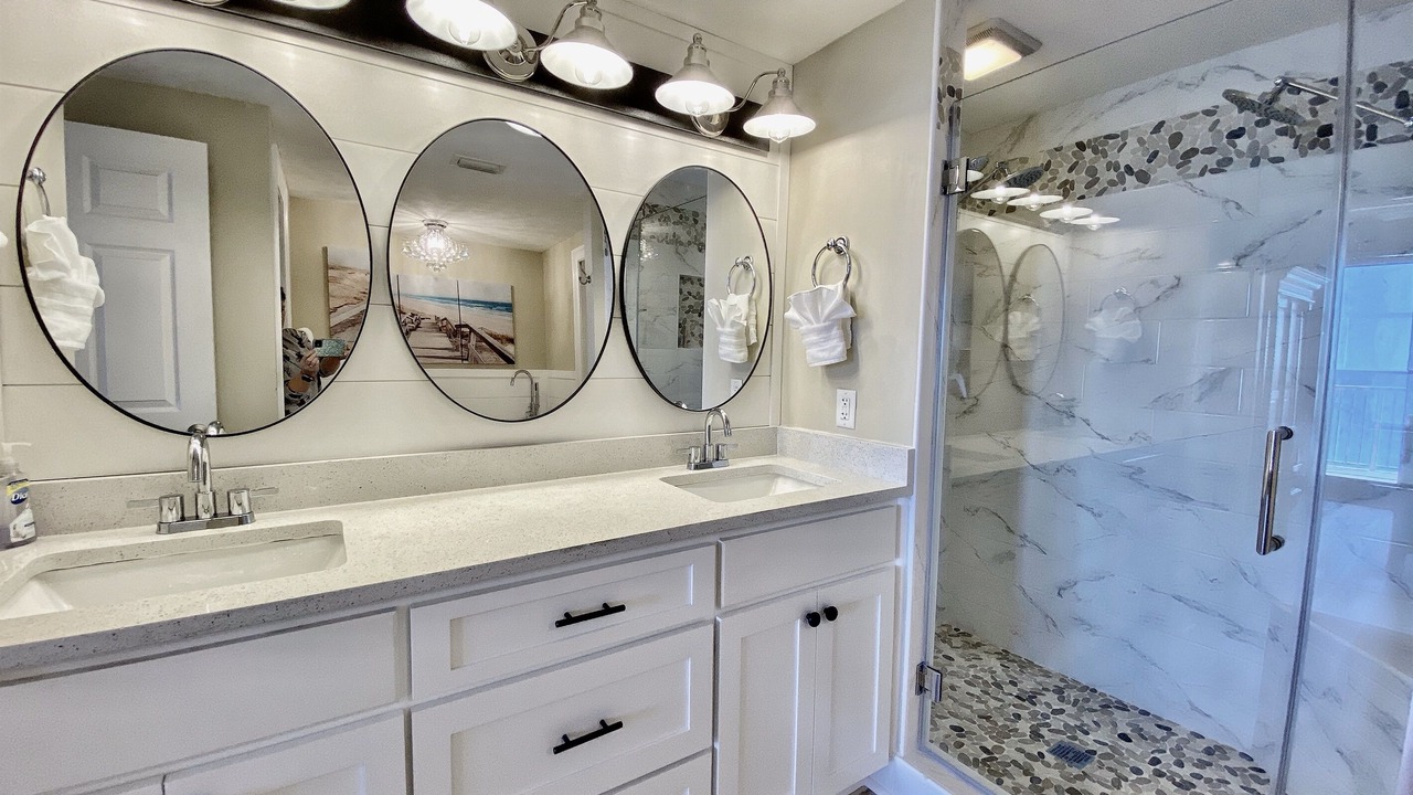 The master bath features a large newly tiled double head shower with plenty of room for two, double vanity with quartz countertops and new stand alone tub (Feb. 2020). The only unit with a tub in the master bath at Treasure Island Resort.