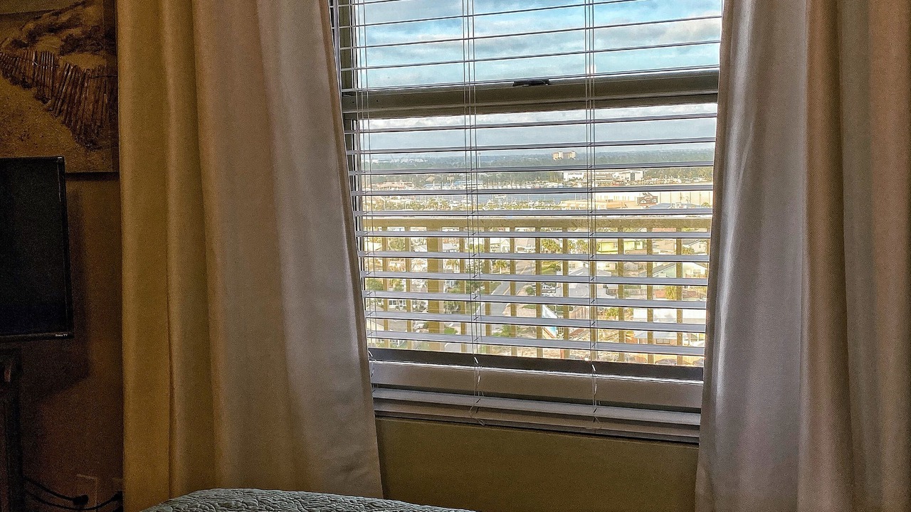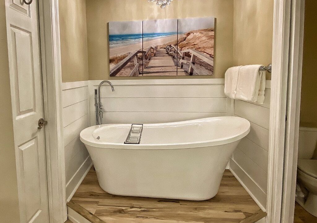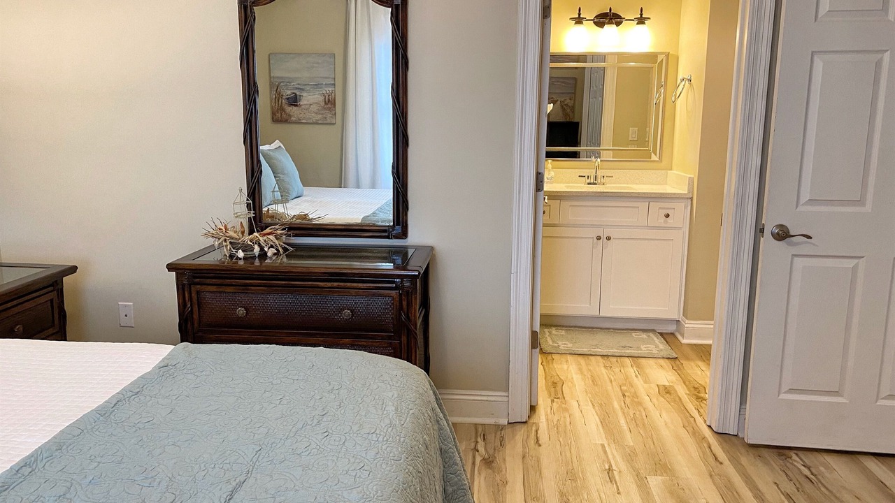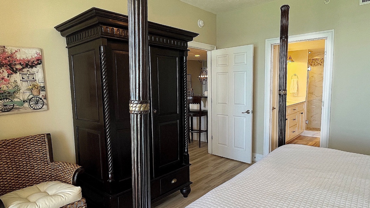 The guest bedroom features a King Size memory foam bed and it includes 32" smart TV. This bedroom has a private bath access. You can see beautiful views of Grand Lagoon from this room.