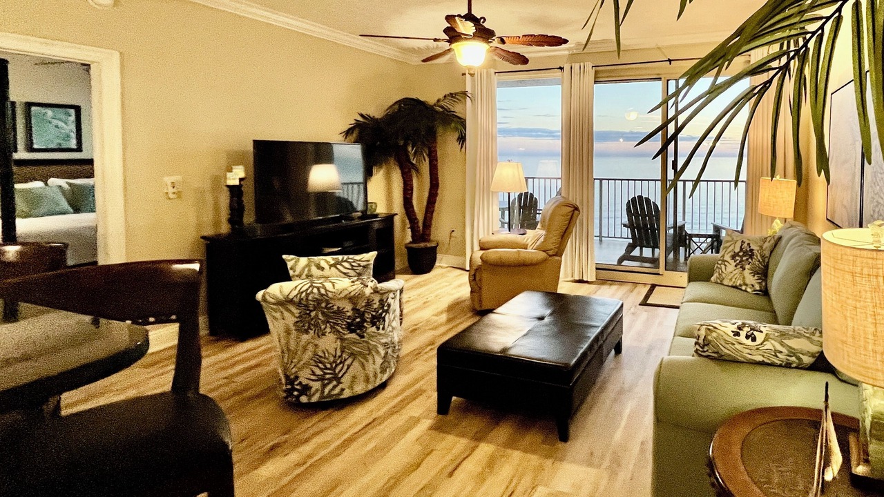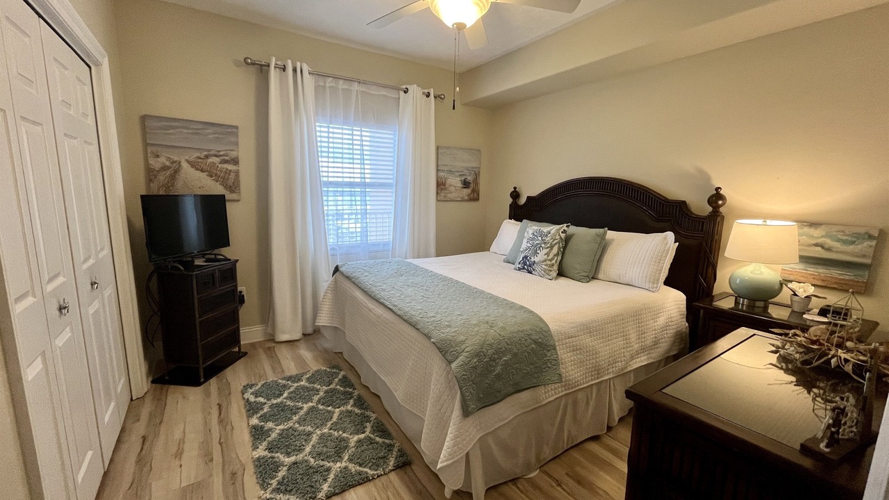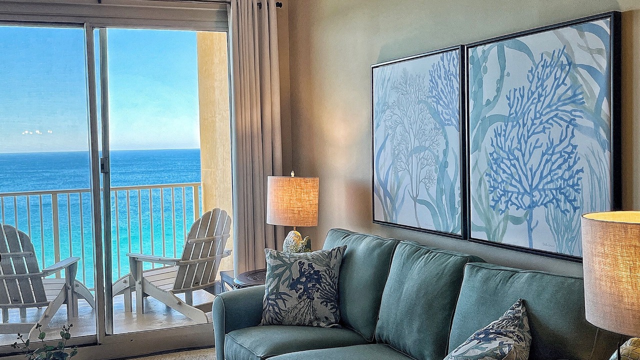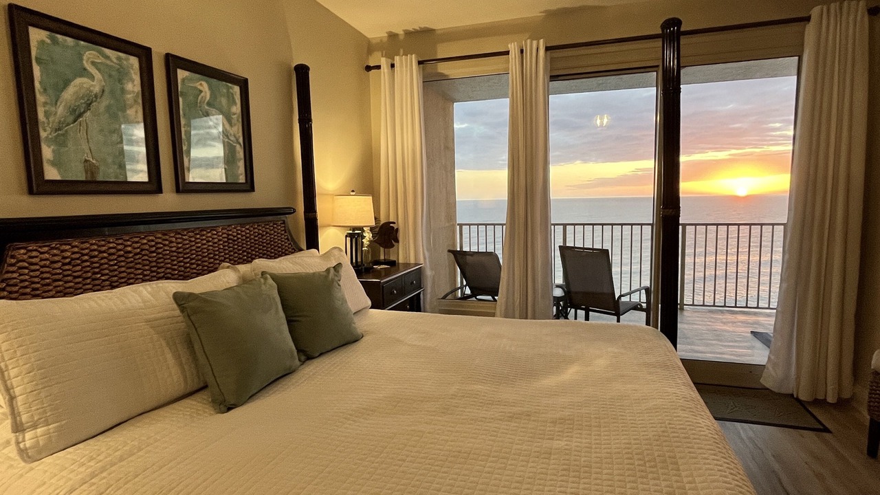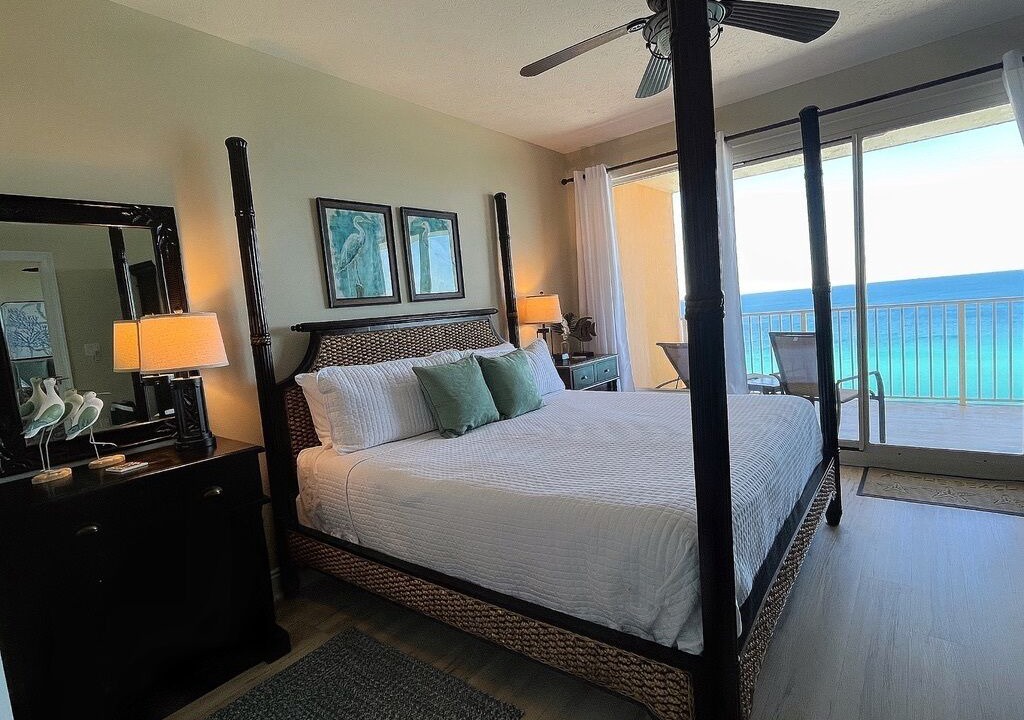 The master bedroom features a King Size Sealy Posturepedic Memory Foam bed with dual side dressers & lamps. This bedroom features a 32" smart tv. Enjoy the views of the Emerald Coast from the luxury of your bed, or step out on the oversized 9' x 30' balcony through the 8 ft. glass sliding doors.
