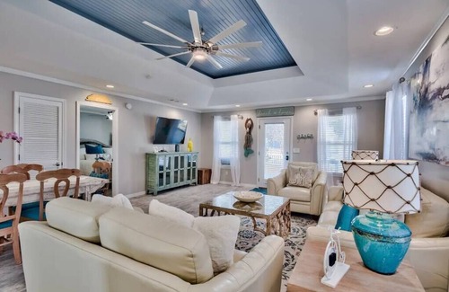 Welcome to Emerald Escape! A mere block from the gulf, where relaxation reigns supreme. Recently updated, this oasis boasts a clean interior, fully stocked kitchen, and private pool and backyard. 2 king suite bedrooms offer luxurious comfort, complemented by a charming bunkroom for young adventurers. Parking, high-speed Wi-Fi In each room, 55-inch TVs, ensuring your stay is both fun and relaxing. Located close to Destin's amenities, our beach house is the perfect haven for your coastal getaway.
