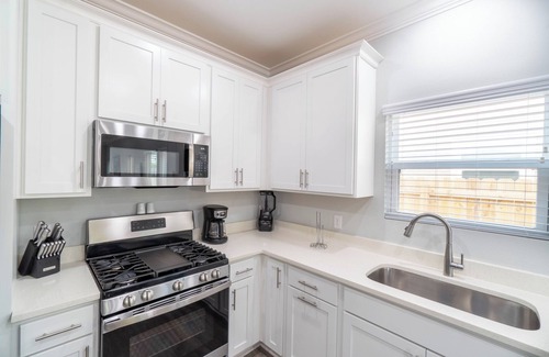 Perfect for families or larger groups, this beautifully designed 4-bedroom retreat features a main house and a private garage apartment—one of the nicest townhomes near downtown Pensacola. The primary bedroom boasts regal comfort with a spacious king-size bed and a luxurious ensuite bathroom for your relaxation and convenience. In the second bedroom, a cozy queen-size bed awaits, providing a tranquil retreat. The third bedroom is perfect for kids or friends, featuring a double bunk bed with full-size mattresses on both the upper and lower levels. A shared hall bathroom ensures convenience for all guests. Downstairs, a convenient powder room is available, and additional sleeping space is provided in the living room with a comfortable sleeper sofa. Enjoy comfort and convenience throughout this inviting home.