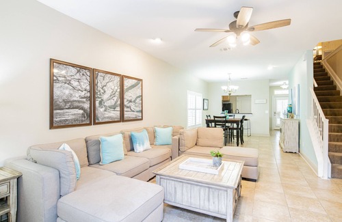 This two-story townhome sleeps up to 10 guests with 2 Master Suites - one upstairs and one downstairs. There is a Queen sized bed in the sleeping nook upstairs off the upstairs living room. Find full over full bunk beds that sleep 4. The serene master suite on the second floor is furnished with a king-size bed. This bedroom has a 42” flat-screen tv and the en-suite master bathroom. The master bathroom is outfitted with a gorgeous walk-in shower. The Downstairs Master Suite has a comfy queen-size bed, flat-screen TV, and a spa-like en-suite bathroom with a jetted tub and walk-in shower. The third guest room features a queen-size bed and en-suite bathroom with a tub/shower combination. This bathroom is also accessible from the common area.